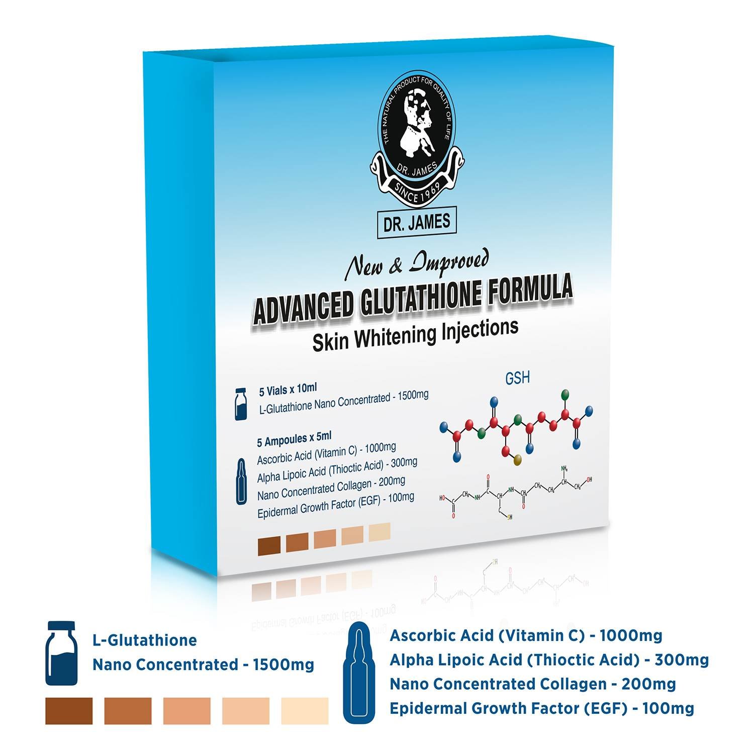 • Dr. James Glutathione 1500mg Skin Whitening Injection visibly fades the look of dark spots for luminous, bright, and fair skin.