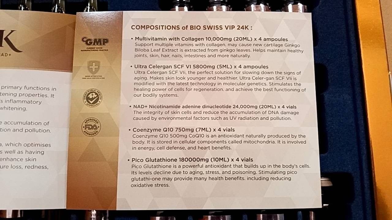 Each box of Bio Swiss VIP 24K Injection contains a powerful mix of skin-enhancing nutrients: