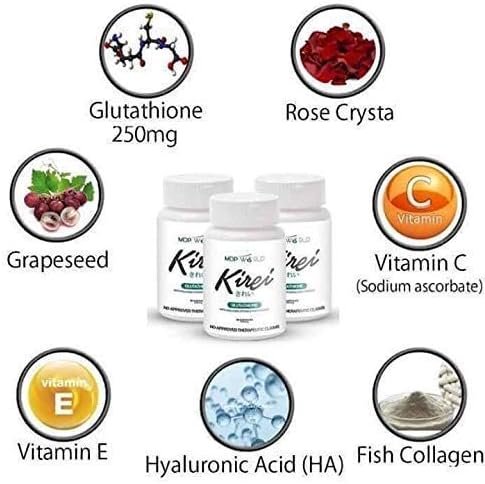 Kirei Skin Whitening Glutathione 60 Capsules’ precise composition may differ, but it usually consists of a combination of glutathione, vitamins, minerals, and other antioxidants. These extra components have been added to boost glutathione’s advantages and promote skin health.